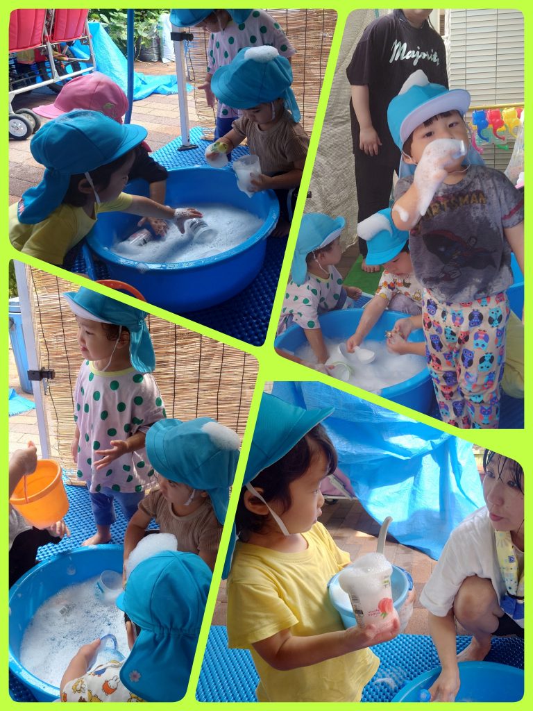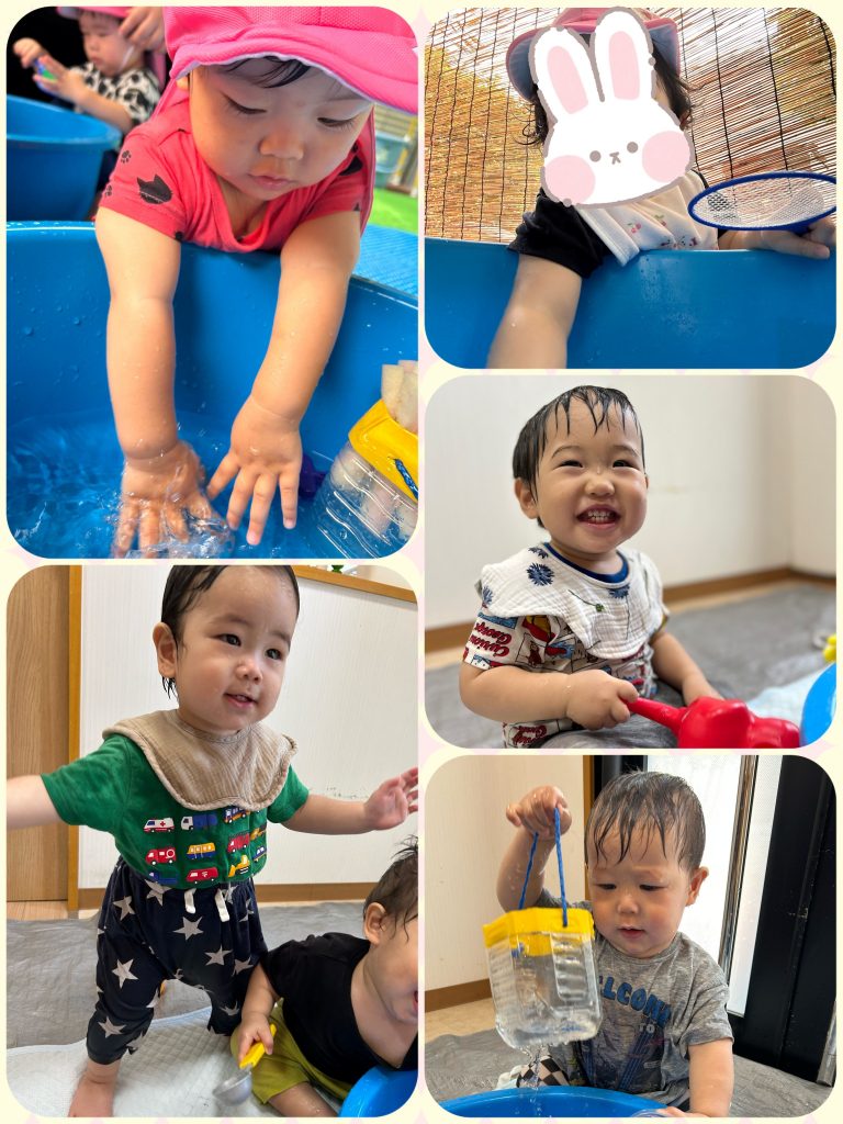 ひよこ組は玄関で水遊びをしました。みんな、顔に水がかかっても余裕が見られます!!水をかき混ぜたり、たたいたり、容器に入れて垂らしたり・・・冷たい水の感触を楽しんでいましたよ💦