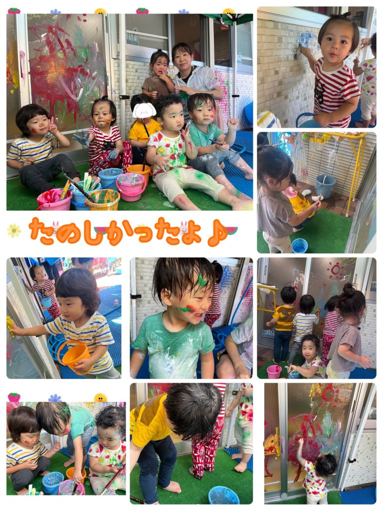はじめは遠慮がちだった子も、慣れてくると自ら顔につけたり、窓に思いっきり絵を描いたり・・・友達の顔に絵の具が付いているのを見つけると「わあ~!ついてる🧹」と嬉しそうに笑っていました。