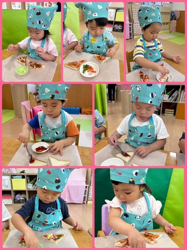 今日のメニューは手作りピザトーストです!①ソースをぬる ②野菜をのせる ③チーズをのせる…の簡単な工程ではあるものの、どの顔も真剣そのものでしたよ。