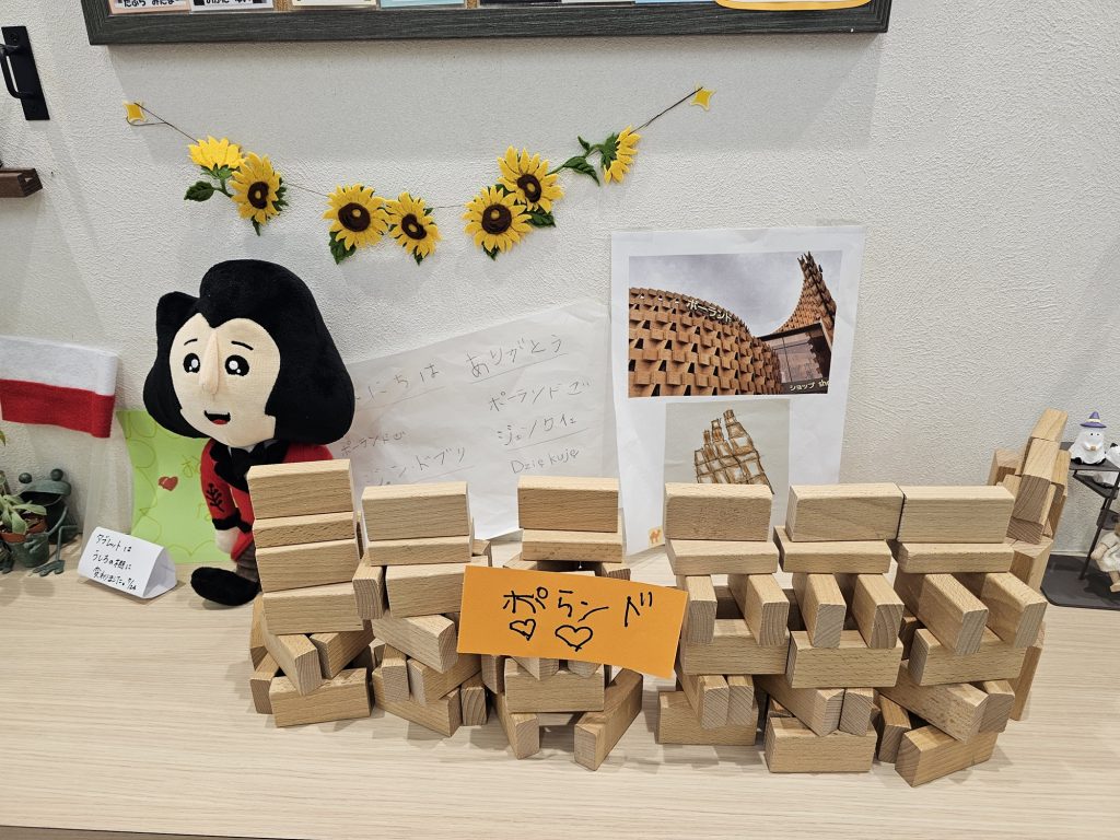 ポーランド館からのお土産の“ショパンちゃん”と一緒に積み木で作ったポーランド館も玄関に飾っています。
