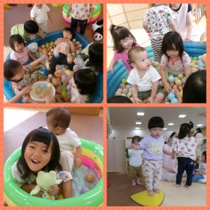 ボールがたくさん入ったビニールプールにダイブしたり、寝転がったり、ボールをガサガサ触ったり、投げたりとお友達と一緒にボール