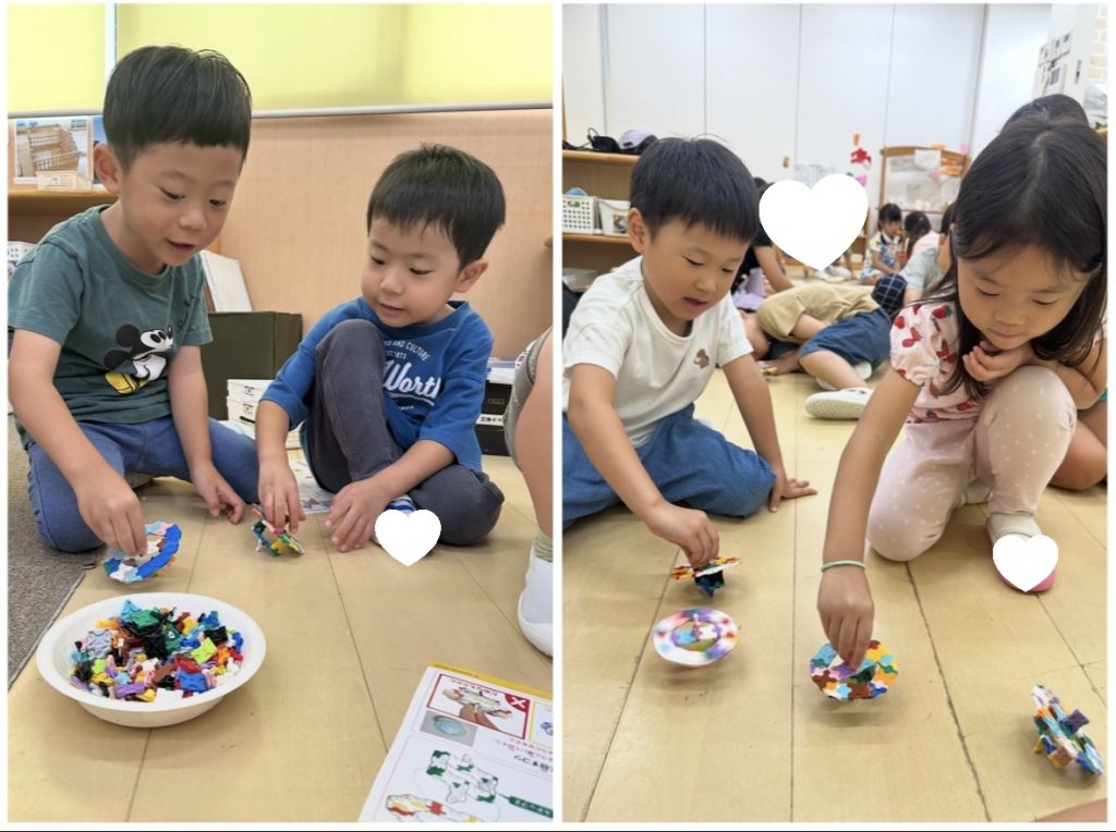 全員でコマ作りにも挑戦しました!説明書を見ながらあっという間に作り進めたり、LaQ博士と一緒に作ったり、みんな真剣な表情で集中して取り組んでいました。早く完成させた子はお友だちに教えてあげる優しい姿も、、