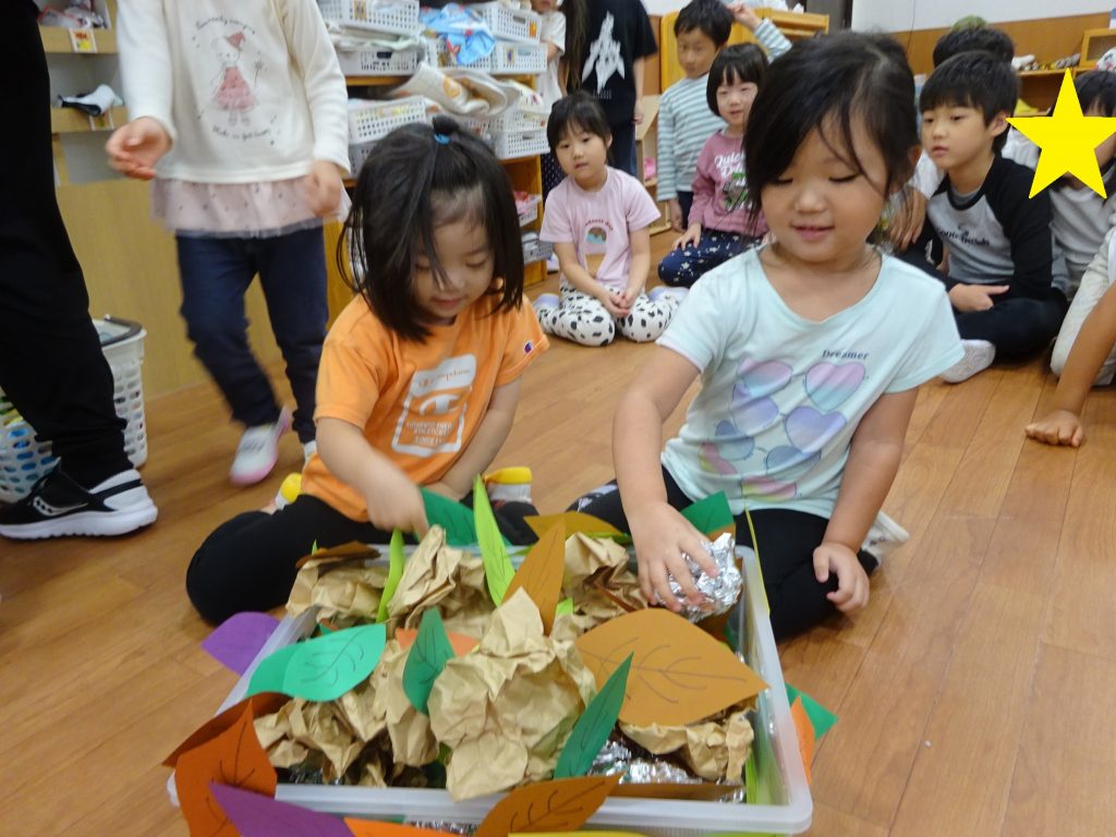「どこにあるかな~」と葉っぱに隠れている「焼き芋」を探す子どもたち。見つけるとっても嬉しそう😊