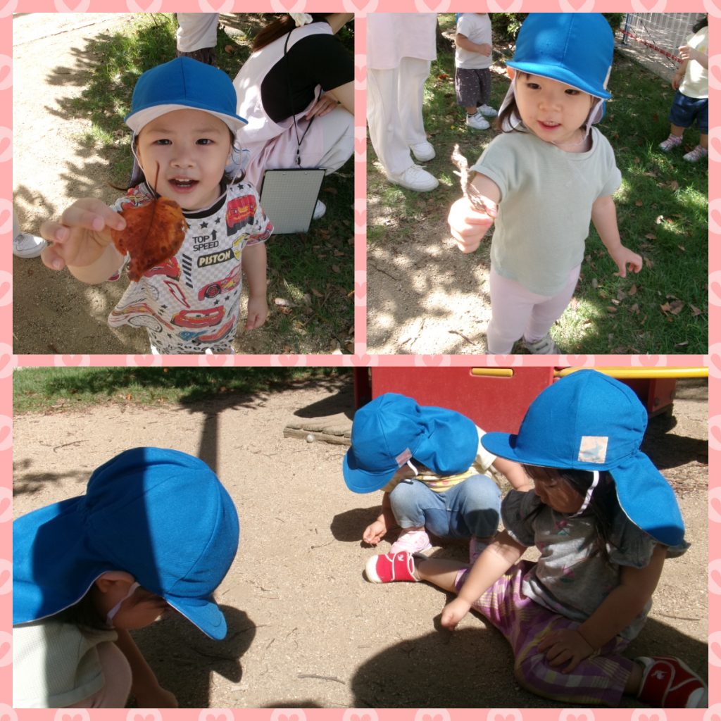 遊具以外でも、落ち葉やどんぐりなど秋の自然物に興味津々!保育士に見せてくれたり、お友達と見せ合いっこしたりしながら「あかいね~」「これおおきいよ!」」とお話しする姿に思わずほっこりでした(*^^)♡