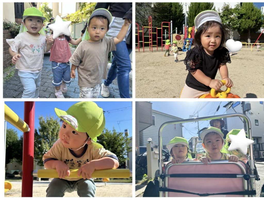 散歩車から周りの景色を眺めたり、保育者やお友だちと手を繋いで歩いたり、