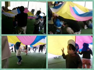 そのあとはパラバルーンに挑戦!ゆらゆら揺らして布が擦れてカシャカシャ鳴る音を楽しんだり、ドームを作って中に入り自分たちだけの空間に大はしゃぎ!