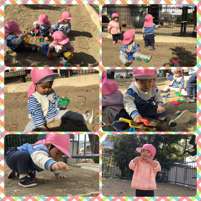 ちゅうりっぷ組は、森公園へ遊びに行き、砂場で遊びました。おもちゃをたくさん出して、真剣な顔つきで砂をすくったり、器に入れたりしています。興味のあるものを見つけると指で上手に摘まんで集めていました。