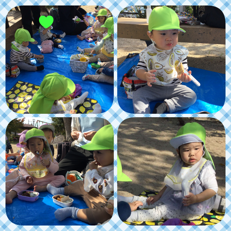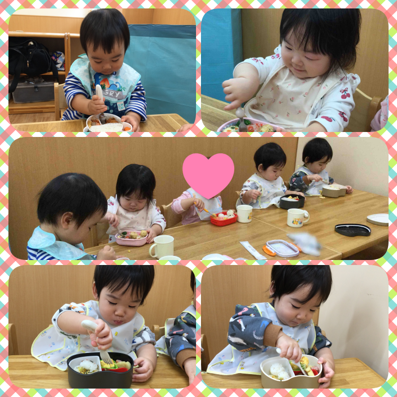 お昼ご飯は保育園でお弁当を食べました。いつもとは違った雰囲気が嬉しかったようで、目をキラキラさせて食べていましたよ。