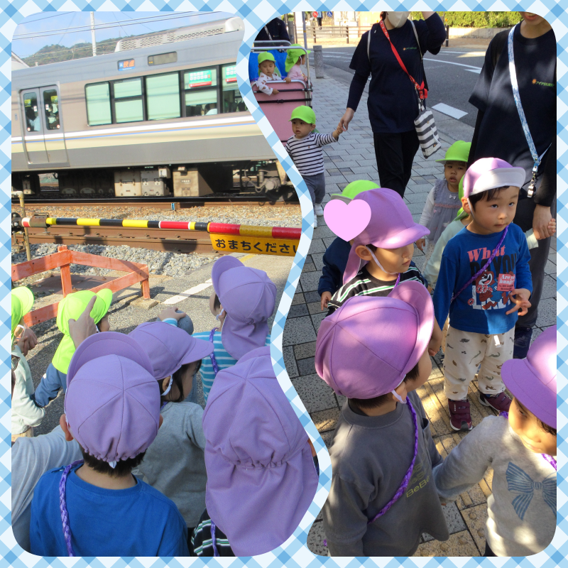 道中に大きな踏切があり、通りすぎる電車を間近でたくさん見ることができて大興奮。公園では、滑り台、砂場、木の実や落ち葉集めなど、夢中になって遊んでいました。