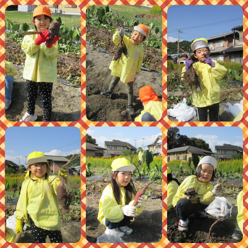 幼児クラスはバスに乗って、北区の岡田農園にお芋ほりに行きました。朝から「大きなお芋取れるかな?」「お弁当を食べるのが楽しみ!」と話をしながら、ワクワクした気持ちいっぱいで出発しました。スコップを持ち、お芋を目指して掘り進めるこどもたち。芋が取れると、「やったー!」「大きいのがとれた!」など、嬉しそうな声がたくさん聞こえました。