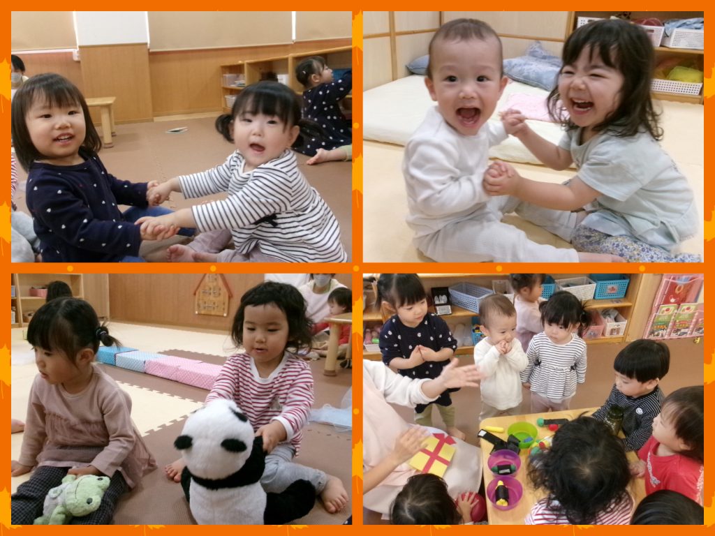 お友達と一緒に!が楽しい時期で最近は「ぎっこんばっこん」というわらべうたも対大人ではなく、子ども同士で楽しめるようになってきました。一緒に触れ合いながら歌って、お友だちと「楽しい!」の気持ちを共有出来て嬉しそうな子どもたちです(^^♪お友だちに興味が出てきてお誕生日会も自然と集まってお祝いする姿が見られますよ、可愛いですね♡