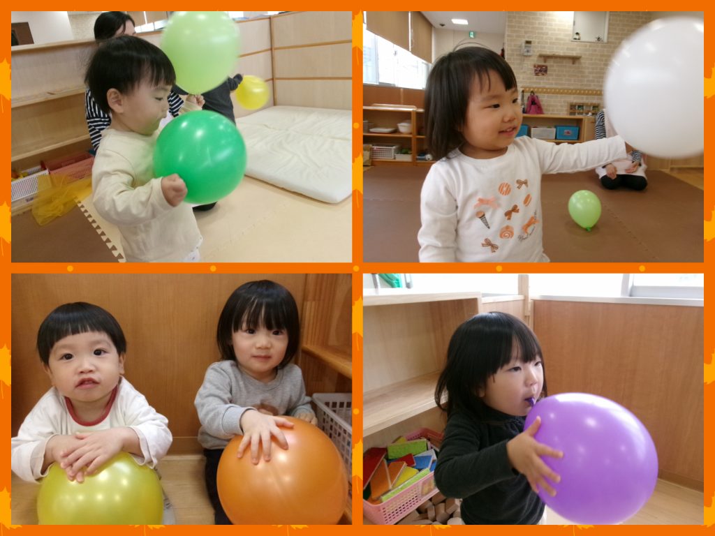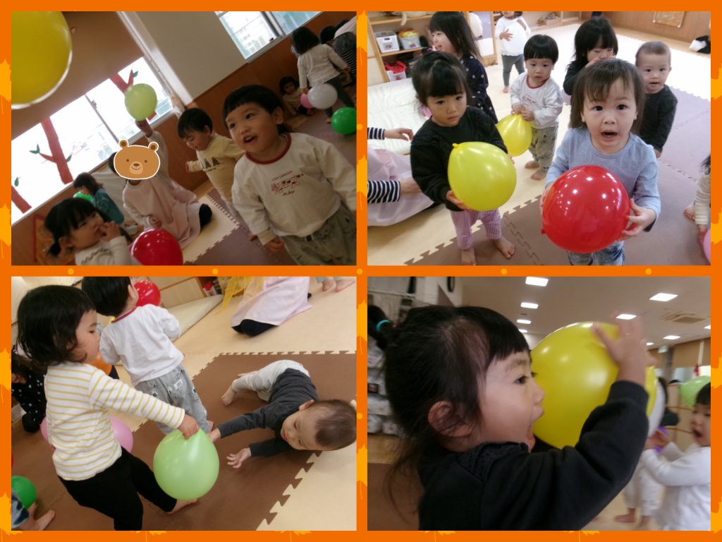 以前、春頃にした時は風船を大事そうに抱えて持ったり、追いかけて遊んでいましたが今回は自分で風船を投げたり、ポイッと上に上げて落ちてくる風船をキャッチしたり、追いかけたりと自分たちで工夫しながらそれぞれが様々な方法で楽しんでいましたよ。