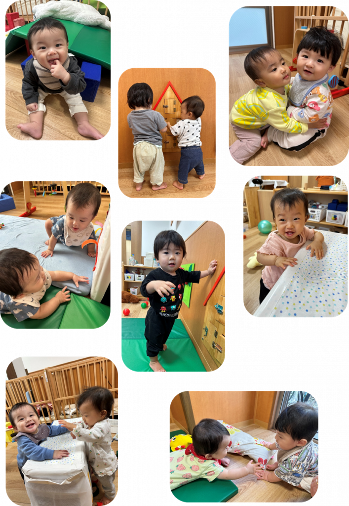 12月に入り、子どもたちの成長がぐんと感じられるようになりました。ずり這いからお座りへ、ハイハイからつかまり立ちへと、著しい発達が見られ、出来ることもどんどん増えてきています。