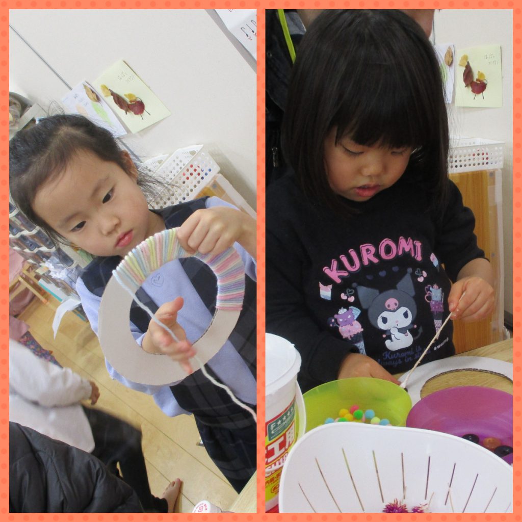 今月はそらぐみ・だいちぐみの【保育参加】があり、【クリスマスリース作り】をしました。