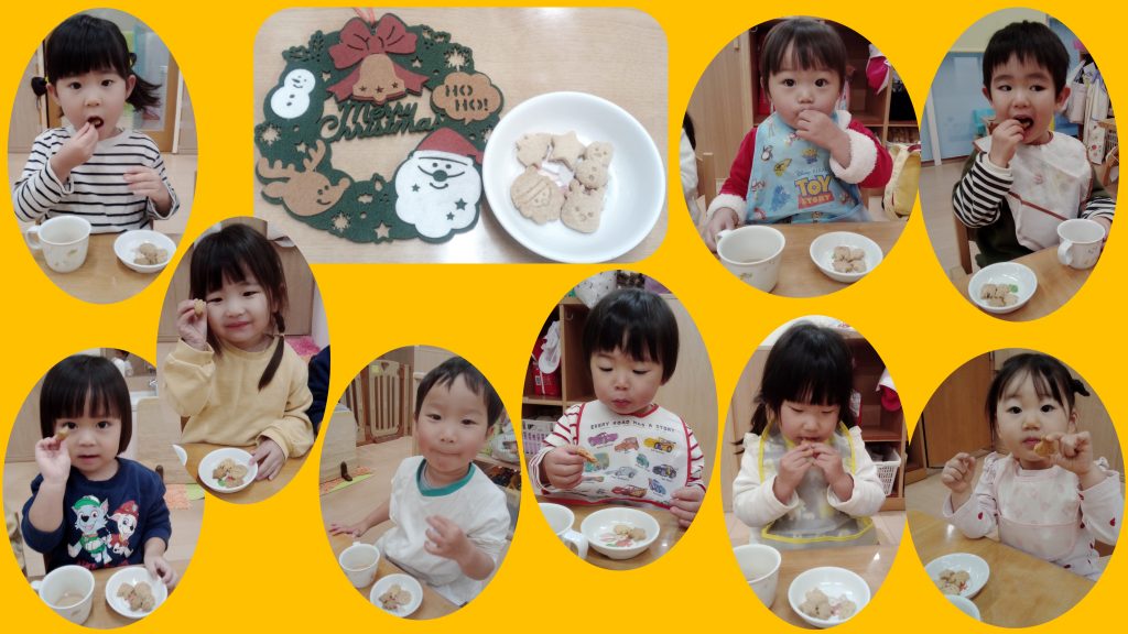 サンタ、トナカイ、ツリー、雪だるま、星とかわいい形のクッキーを見て「どれから食べようかな?」「見てー、サンタさん😄雪だるまもあるね⛄️」と食べる前からワクワクの子どもたち✨