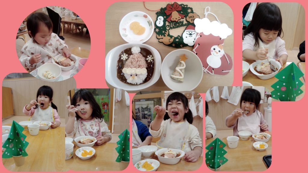 メニューはサンタさんの顔のハヤシライスとツリーのポテトサラダ、デザートのみかんで、子どもたちは「サンタさんだ〜❗️😊」ととても嬉しそうでした。