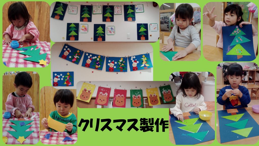 製作をしたり、自分たちの作品をクリスマスツリーに飾り付けしたり、絵本を見たり歌をうたったりしながら「サンタさん、ツリーのところにプレゼントくれるんだよね🎁」「リンリンって鳴らして来るんだよね〜🔔」とクリスマスを心待ちにしてきました😊
