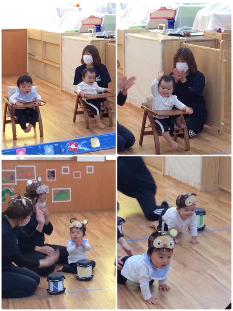 ひよこ組は朝の会や日常の保育(楽器遊びやリズム体操)の様子を保護者の方に見てもらいました。普段通り参加する子や、状況を理解し幕が開くと多くの保護者に見てもらってることに緊張する子など、様々な可愛い姿が見られましたよ♪