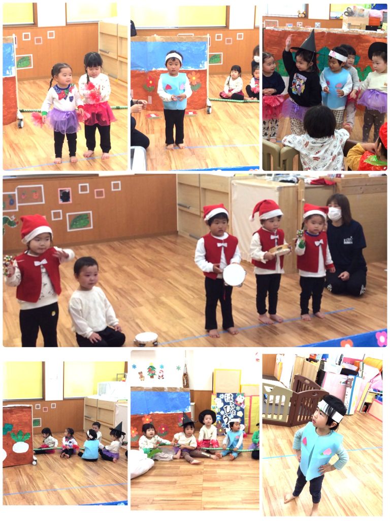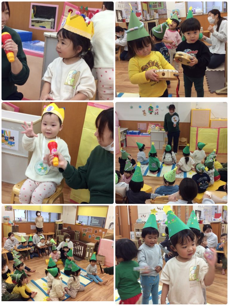 誕生日のお友達は、お祝してもらって嬉しそうでした♪クリスマス会では、クリスマスにまつわる出し物を見たり楽器遊びをして、クリスマスの雰囲気を味わいました。