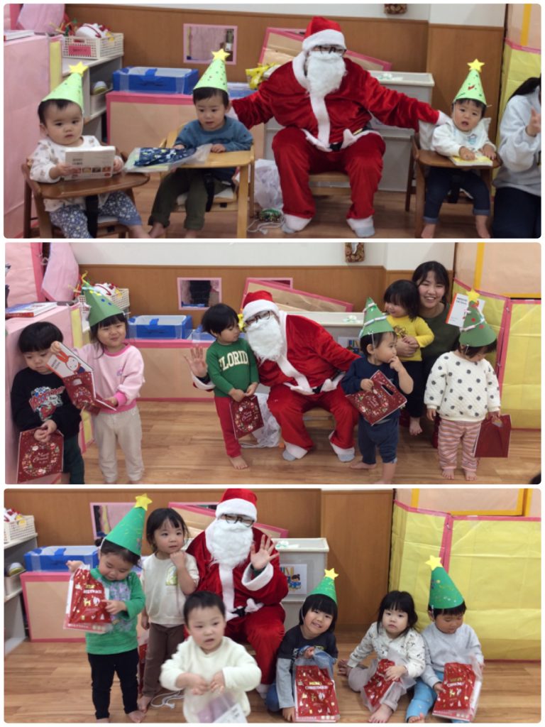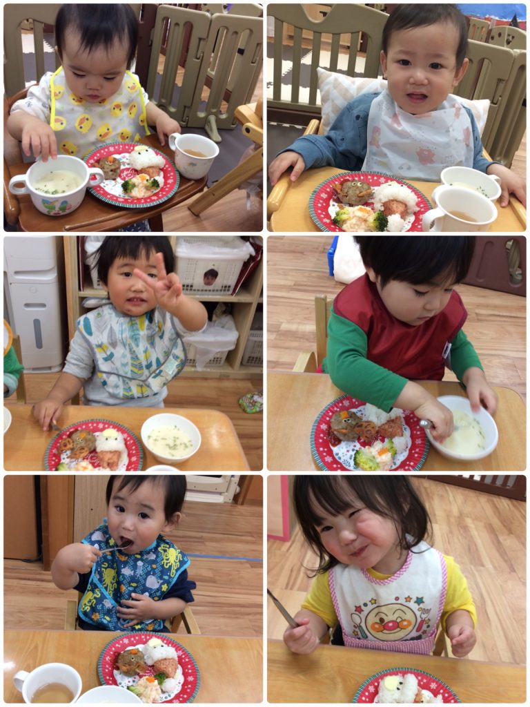 クリスマスランチに大喜びでした。じっと見たり、「サンタさんや~!」「トナカイさんおる♪」と大興奮の子どもたちです。