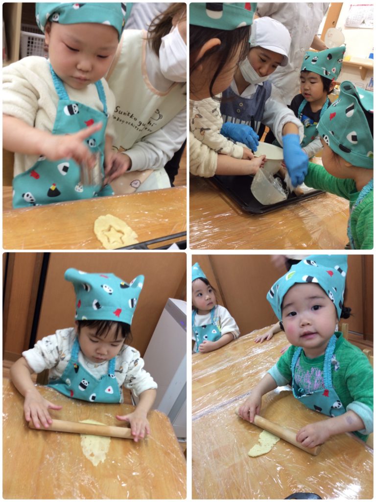 おやつのクッキーを作りました。上手に伸ばし、型抜きをする子どもたち♪