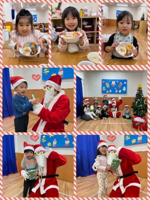 びっくりして泣いてしまうお友だちもいましたが一人ずつプレゼントをもらうことができました🎁🎁🎁