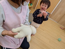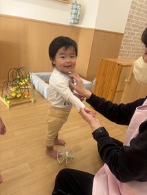 道具がいらないので、お散歩中、おむつ替え、待ち時間など、どんな時でも大人の手が一つあれば、そこが豊かな遊び場に変わるので、わらべうたを日常的に取り入れて、子どもたちの情緒の安定にも繋がっているようです。
