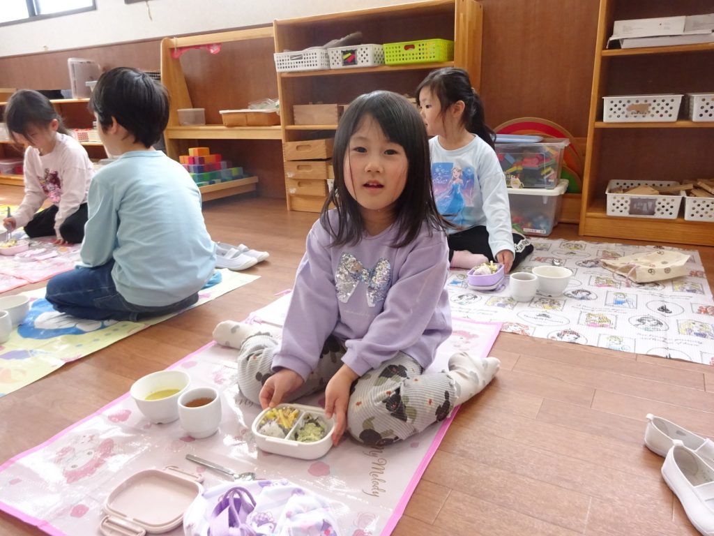 仲良しの友だちの近くにレジャーシートを敷いて、わいわいと楽しく話をしながらおいしそうに食べていましたよ😋 苦手な食べ物もいつもと違う雰囲気に食べることができ、みんなのお弁当箱はピカピカでした✨