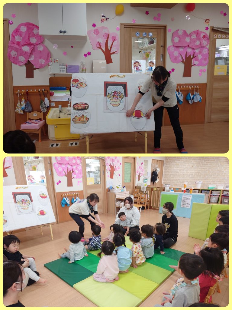 パネルシアターでは「魔法の電子レンジ」というお話を見ました。空っぽのお皿を電子レンジの中に入れると・・・あら、不思議!!