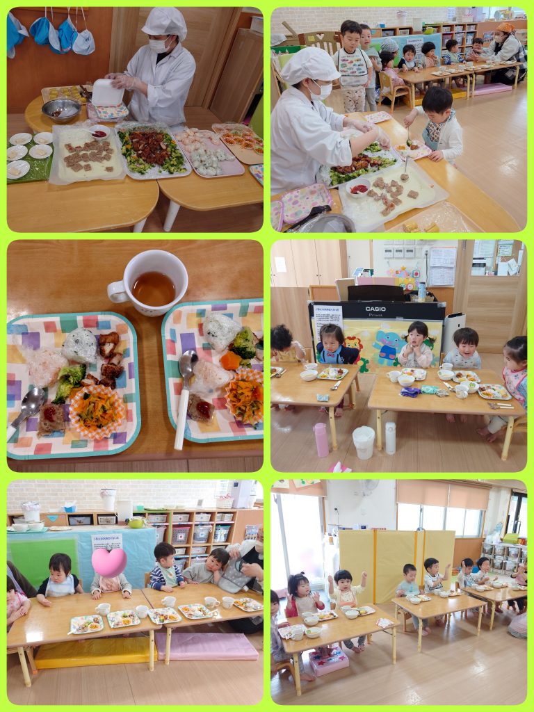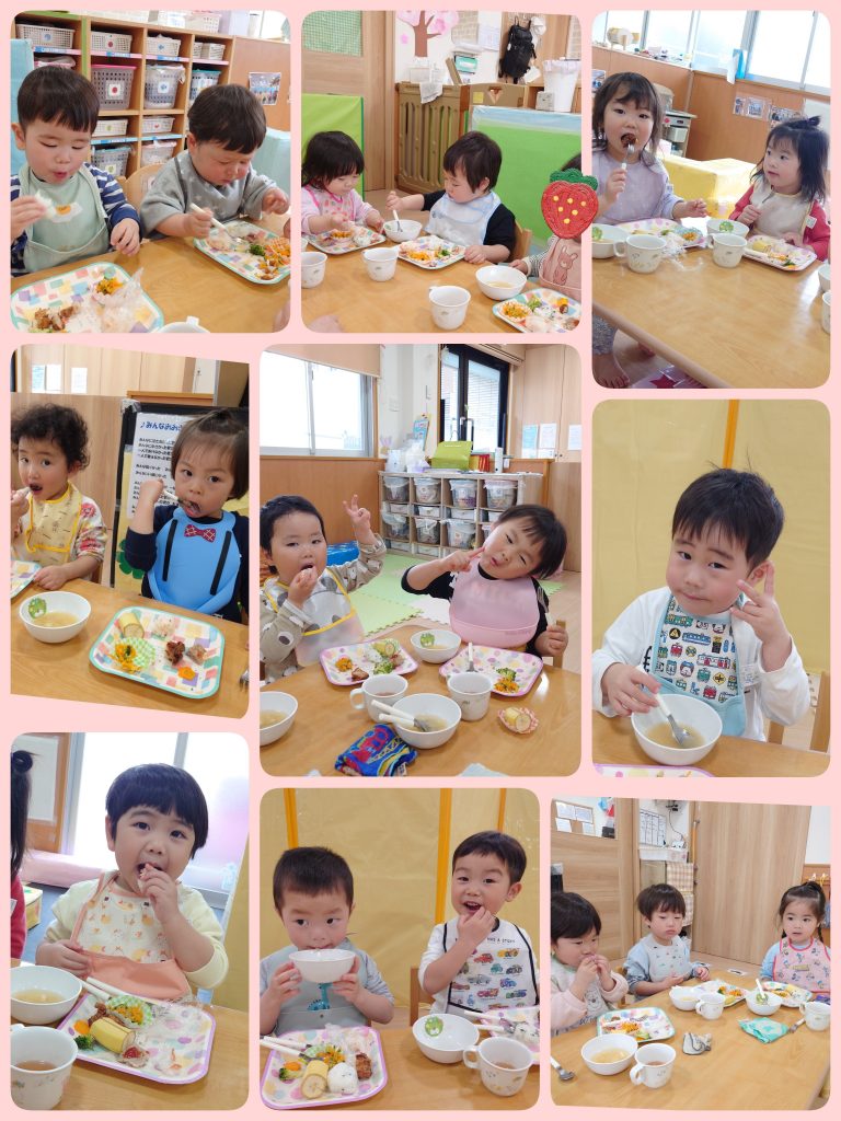 そして「いただきます」をするまでは目の前のおいしそうなご馳走を見ながら「これ好き~♡」「どれから食べようかなぁ」など、1.2歳児は友だちとの会話も弾んでいました。