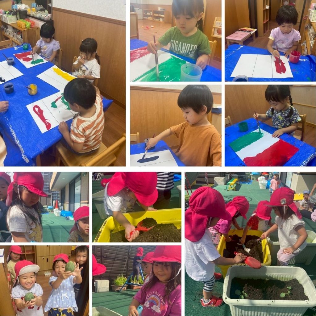 さらに、今月は絵の具と筆を使っての制作活動も初体験! 運動会の装飾に使う国旗を描きました。 初めての絵の具に少し緊張しながらも、 カラフルで素敵な作品ができあがりました。