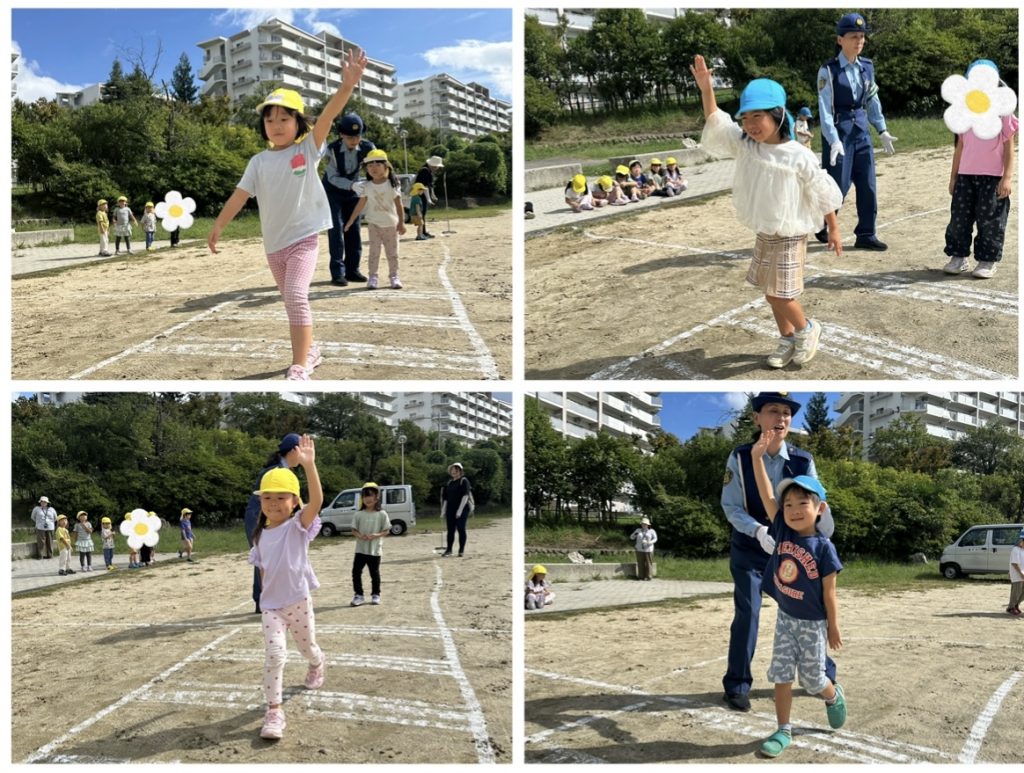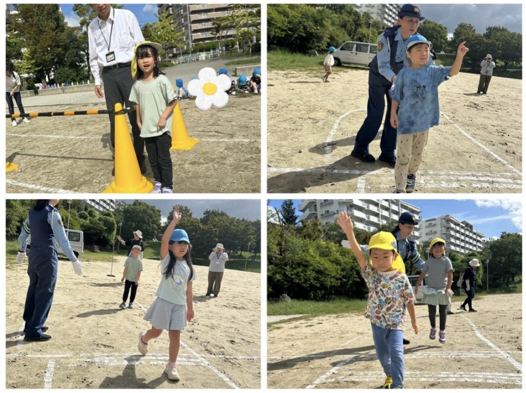 信号をよく見て、青になったら左右をしっかり確認し、手をあげて横断歩道を渡っていました。ちょっぴり緊張する子もいましたが、最後までしっかりと歩き、警察の方に上手に歩けたことを褒められると、誇らしげな表情の子どもたちでしたよ♪