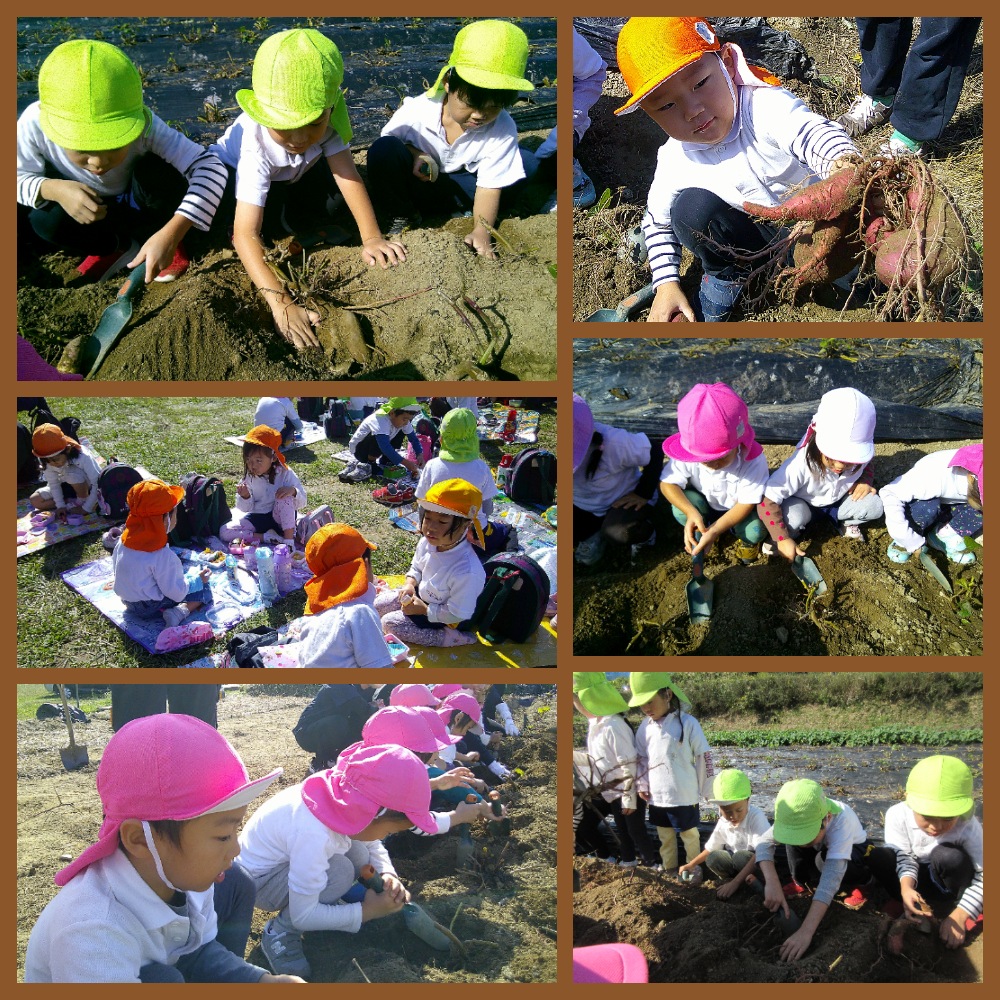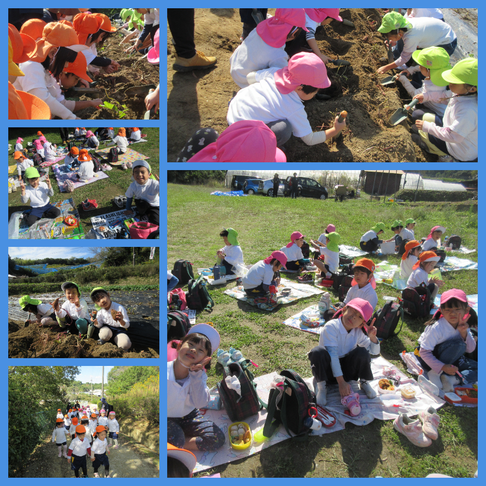 だいちぐみ、そらぐみで秋の遠足に行ってきました。秋晴れの中でお芋ほりに挑戦しました。虫がいる!とダンゴムシに夢中になったり、お芋がないよう!なんか変な虫がいるよう!と賑やかないもほりになりました。掘り始めて芋がみえてくるとにっこり笑顔で見えてきたよと教えてくれました。友だちがほれたのをみると僕もがんばるぞー!と気合が入ります。次々に芋が出てきてみんなでワイワイ賑やかな経験ができました。待ちに待ったお弁当タイムでは、とびきりの笑顔でたべていましたよ。ありがとうございました。虫取りにどんぐりもひらって秋の自然を満喫できました。帰りのバスでもゆったりと過ごし無事に園に帰ってきました。