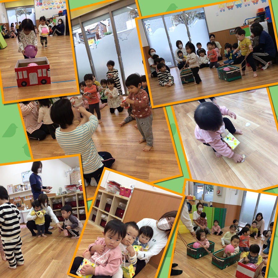 「おおがたバス」歌に合わせて、ハンドルを持って運転したり、お散歩バックを持って、キノコにドングリ、栗を拾って「キノコがいっぱい!」と秋の味覚狩りを楽しみました😊