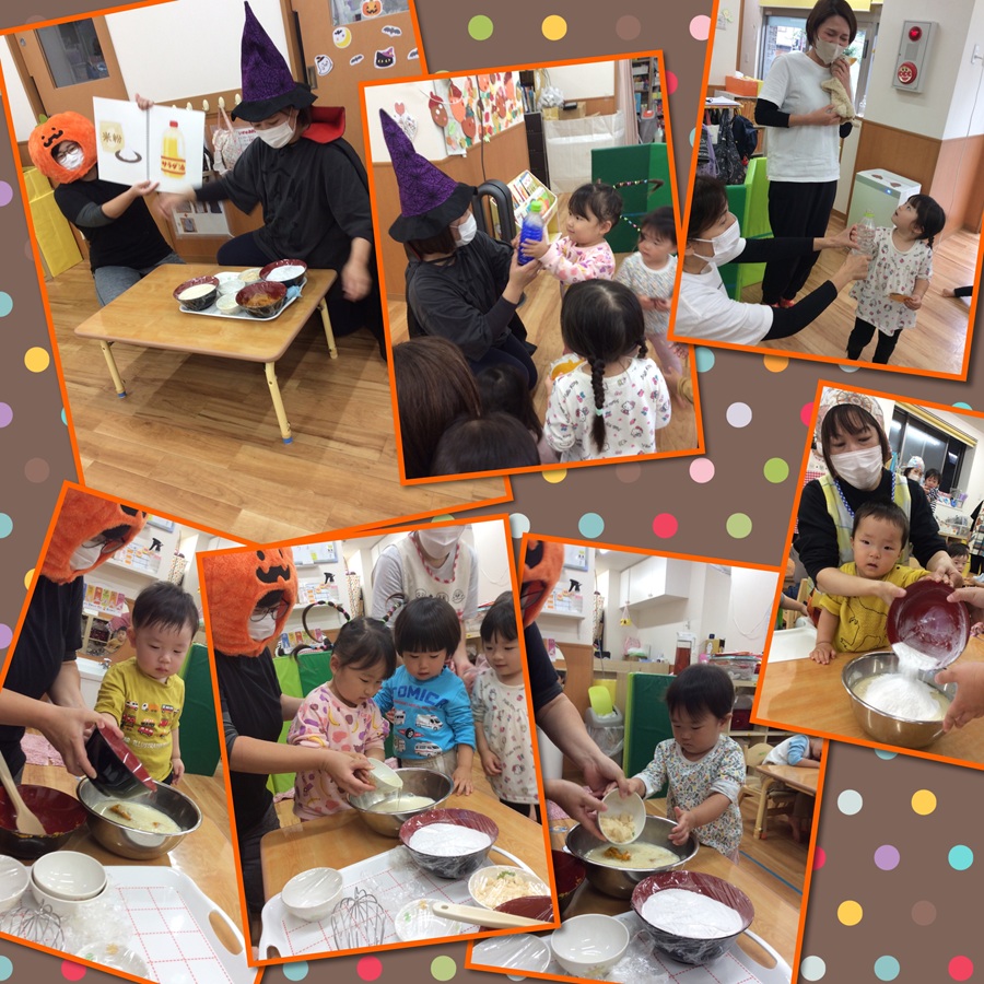 魔女のまこちゃんとパンプキンくんがやってきて、一緒にクッキングをしました。