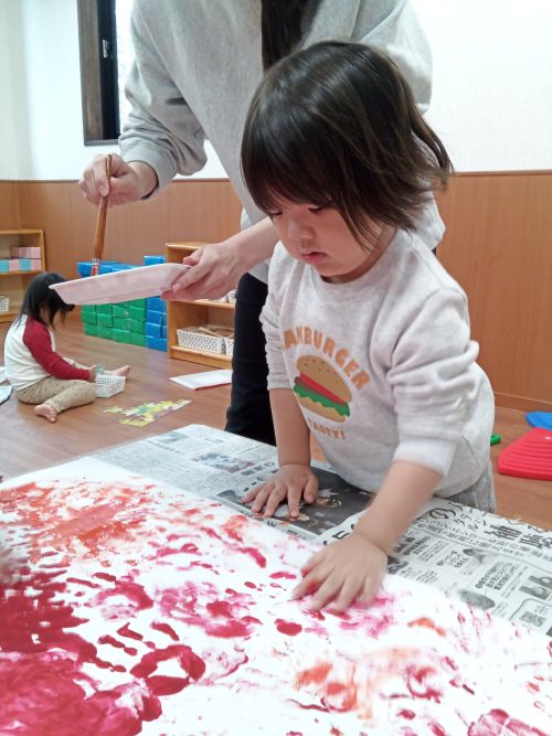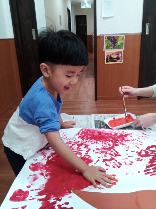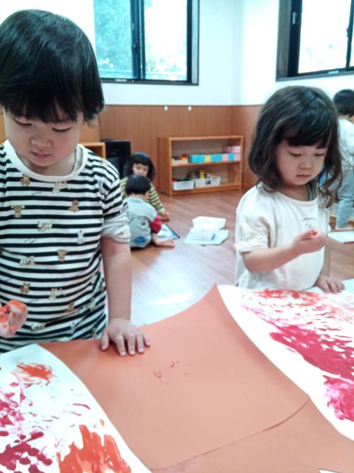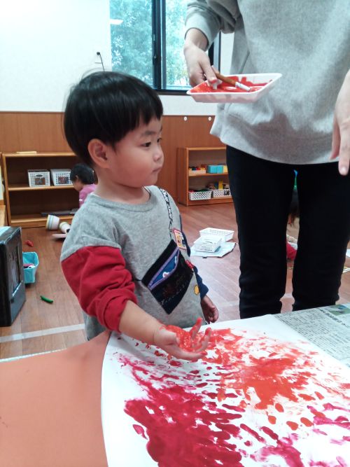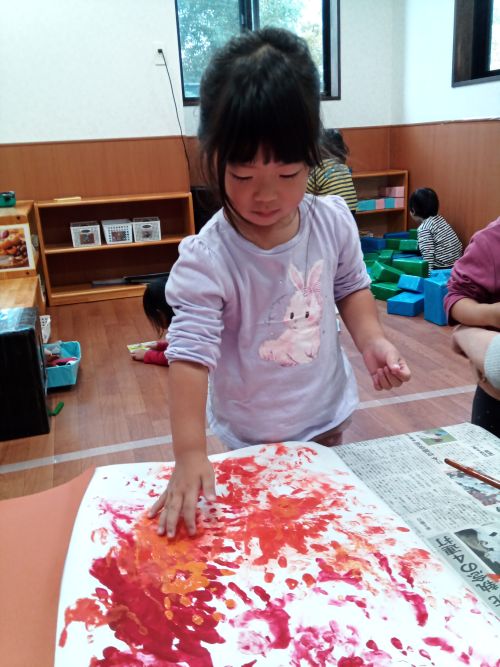 赤やオレンジの絵に具を手にたっぷりつけて、好きなところに