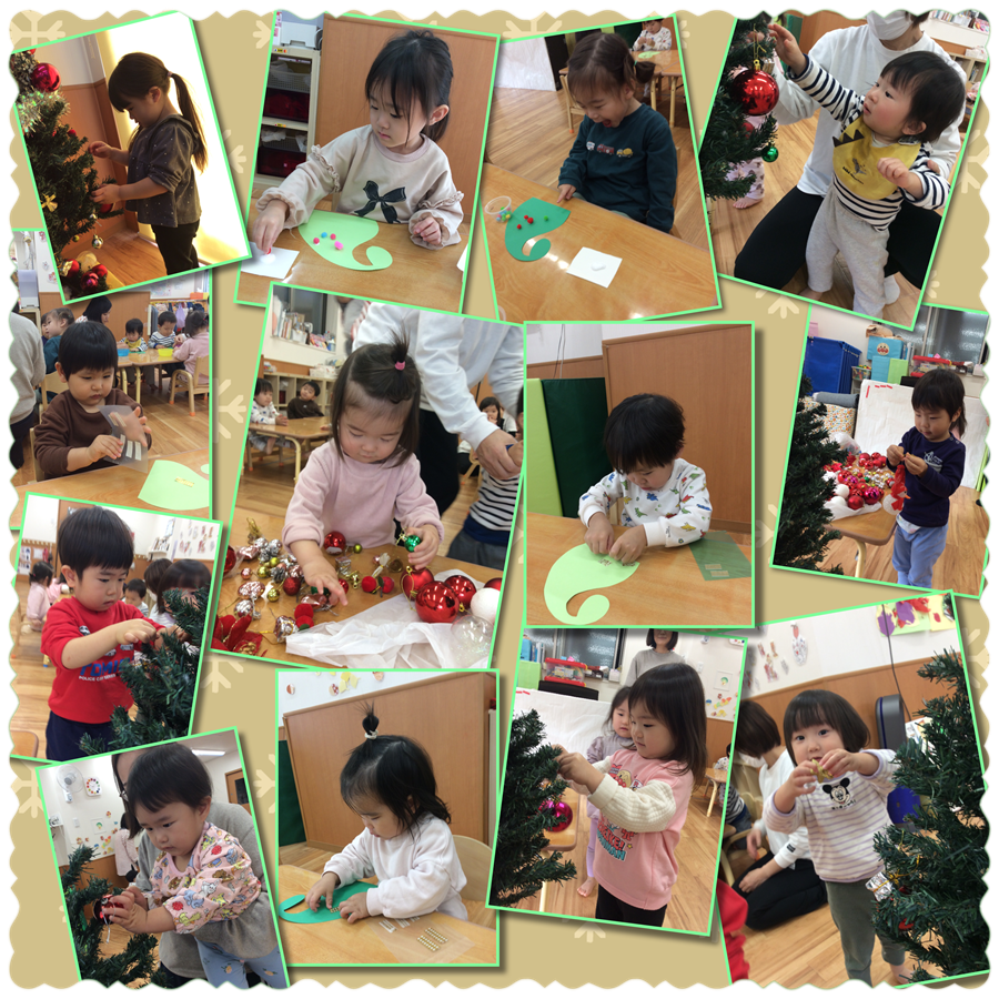 先月、みんなで一つ一つオーナメントをつけツリーの飾り付けをしました。部屋を暗くして点灯すると赤や青・緑などピカピカ光る様子にクリスマスを心待ちする姿が見られました。散歩に出かけても、雪だるまやサンタ・ツリーなど街並みもクリスマス色に染まっていく様子により一層ワクワクが止まらない子どもたちです。