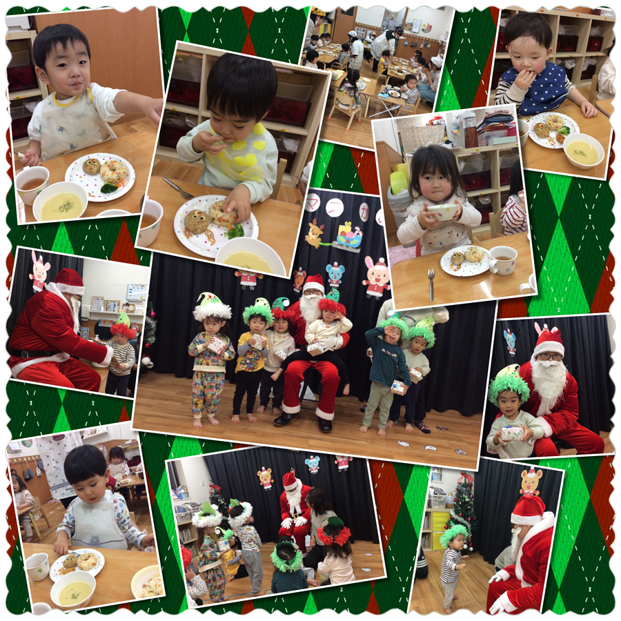 給食もトナカイやリースなど色んなデコレーションされたメニューに大はしゃぎ!!「おいしい!」といつも以上に食欲旺盛でした。3時のおやつもイチゴやミカンなど自分でデコレートしたパフェを堪能しました。一日めいいっぱいクリスマスを満喫した子どもたちです。