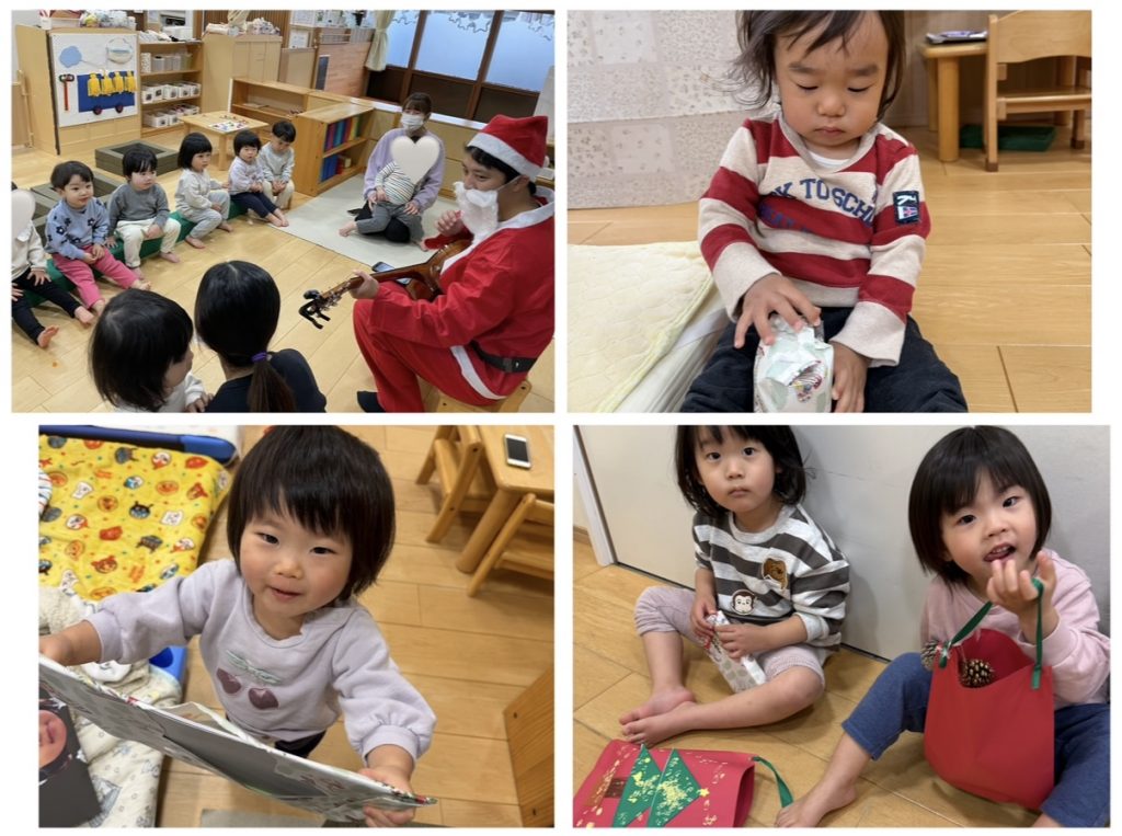 お昼寝中にはサンタがプレゼントを置いて行ってくれました☆起きてプレゼントを見つけた子どもたちは大喜び!夢中でプレゼントを開け「サンタさんきたね」と嬉しそうな笑顔を見せていました♪