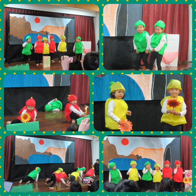 『じごくのそうべえ』の劇をしました。たくさんのセリフを覚え、1人1人が役になりきり演じていました。緊張の中に、普段の様子もチラリと見せてくれるようなサプライズ。最後の発表会を立派に演じてくれたたいよう組さんに拍手です。