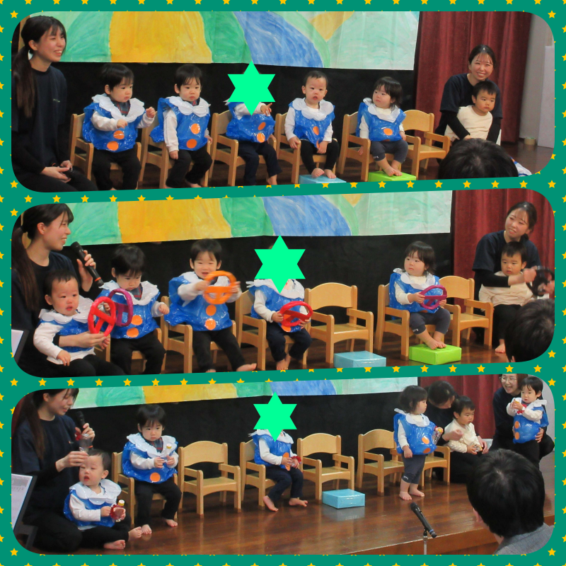 『楽しい発表会』のお話あそびをしました。歌に合わせてハンドルを回したり、手遊びやマラカスを振ったりして遊びました。緊張から涙する子、無の心で立っている子、笑顔で遊んでいる子とそれぞれでしたが、たくさんの観客の前でお椅子に座ってかわいい姿を見せてくれました。