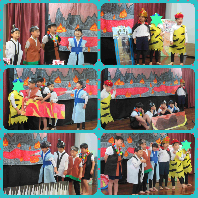 『めっきらもっきらどぉんどん』の劇をしました。体調不良でお休みのお友達がいましたが、お友達の演技もしっかりと覚えていて、助け合って代役を務めていました。自分たちでやりたいこと、得意なことを話し合い、劇の中で披露してくれましたよ。
