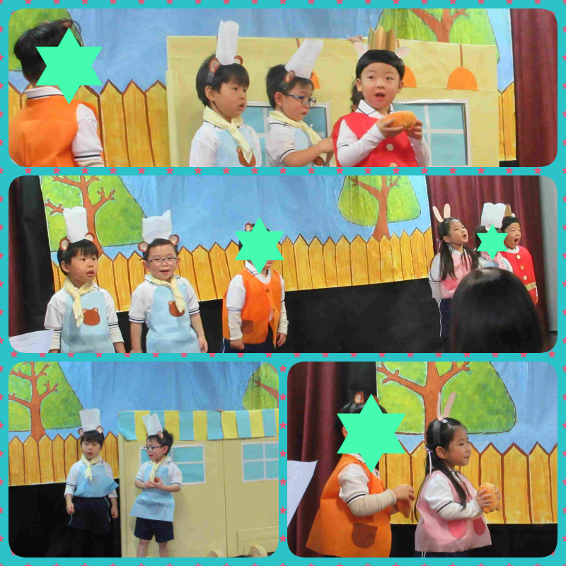 『くまくまパン』の劇をしました。緊張しながらも、元気よくお歌を歌ったり劇を楽しんでいます。雰囲気に慣れてくると会場の外に聞こえるぐらい大きな声で立派に演じていましたよ。