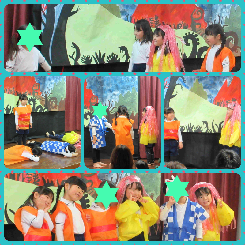 遊びの中からお話が生まれ、日々お話遊びを楽しみながら過ごしていた子どもたち。大きなクラスになるほどに練習を重ね、当日を迎えました。普段とは違う会場での大舞台。一人一人が自分の持てる精一杯の力を出し、演じ終えた後の姿は、みんなキラキラと輝いていました。