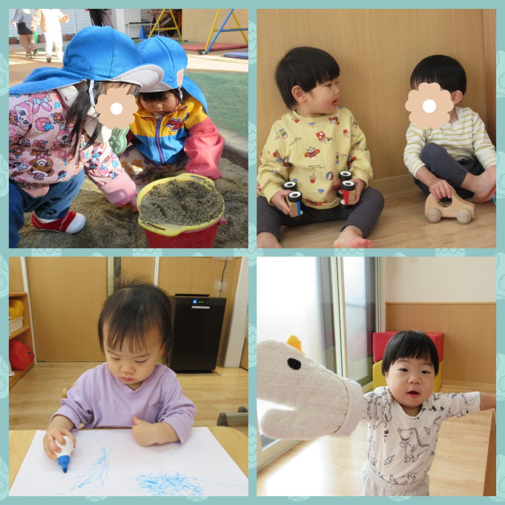 ひとり遊びが主だった子どもたちですが、友だちの存在も意識し始め楽しく関わる姿が多くなってきました。友だちと追いかけっこをしたり身体を動かして笑いあったり、笑顔であふれています。