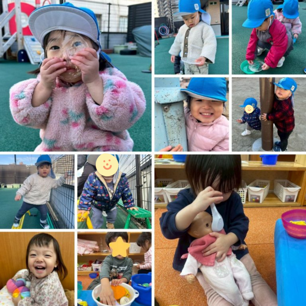 寒さなんてへっちゃら! 元気いっぱいのつきぐみさん❄️✨ 凍ったお水を見つけて 「冷たい〜!」「向こう側が見える!」と大喜び🧊😆 お部屋では赤ちゃん人形に「あーん」とごっこ遊び🥄 おままごとでお料理を作るのも最近のブームです🍳💕たいようぐみ☀️
