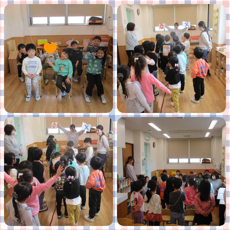 幼児クラスは、質問コーナーや〇×ゲームをしました。質問コーナーでは、小学生になるお兄さん、お姉さんにいろいろな質問をしていましたよ。〇×ゲームは、たいよう組さんの一番好きなものを当てました。「一番好きなものは○○です。」というクイズにどちらに行こうかと迷うみんな。正解すると大喜びでとても盛り上がっていました。