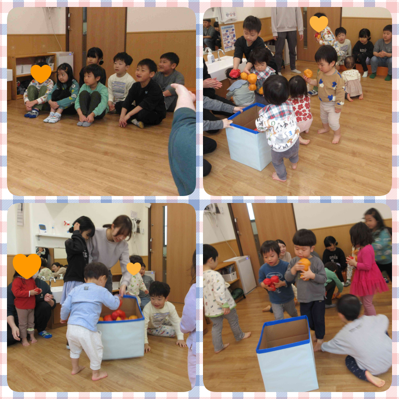 乳児クラスは、玉入れゲームをしました。クラス対抗で行い、たいよう組のお兄さんお姉さんが手伝ってくれました。とっても楽しかったようで、もっとしたいと涙するお友達もいましたよ。