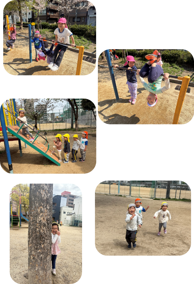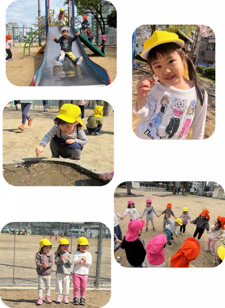 公園では、春の草花を見つけて春を感じたり、わらべうたをしたり、滑り台、鉄棒などの様々な遊具を使って、たくさん体を動かしています。