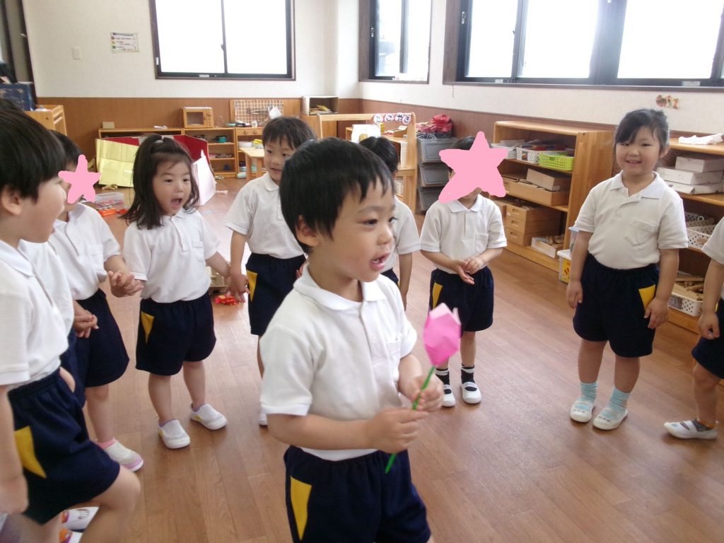 わらべうたあそびや鬼ごっこ、いろいろな遊びの中で友だちの名前を覚えたり、存在を知って関わる姿が見られます。「やってみたい」「やってみせてあげよう」と、お互いに刺激を受けている様子がたくさん見られました。